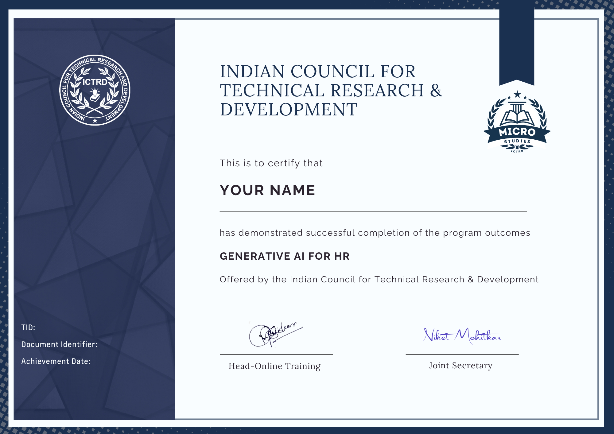 This micro-certification includes concise, self-paced learning modules that you can complete quickly while gaining highly practical skills.Throughout the program, you’ll dive into the fundamentals, real-world applications, and strategic impact of Generative AI in HR.You’ll also learn how to create effective HR-focused prompts using proven prompt-engineering techniques to improve the accuracy and usefulness of AI-generated outputs.The course showcases how Gen AI can streamline core HR functions from recruitment and onboarding to employee engagement and workforce planning.You will explore widely used Gen AI tools and platforms including ChatGPT All of this is delivered with practical, real-world demonstrations to help you apply AI confidently in your HR role.